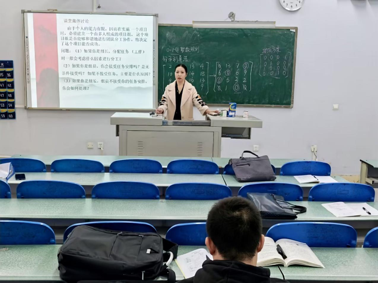刘秋杰老师进行了题为运筹学“指派问题”的课程展示,向大家讲解指派问题匈牙利算法的具体步骤,并结合现实生活中的团队分工合作问题进行了思政育人,培养员工的全局观念和责任感。同时,以革命先辈们在战斗中的任务指派为例,强调在复杂的战争环境下,如何根据每个人的特长和战场需求进行合理的指派,以实现战斗目标的最大化。
