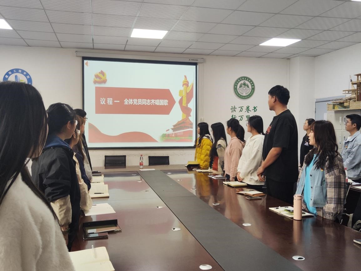会议第一项议程,全体起立,奏唱国歌。在雄壮的《义勇军进行曲》旋律中,全体党员整齐肃立,怀着对祖国崇高的敬意,齐声高唱国歌。