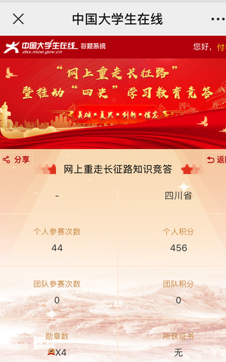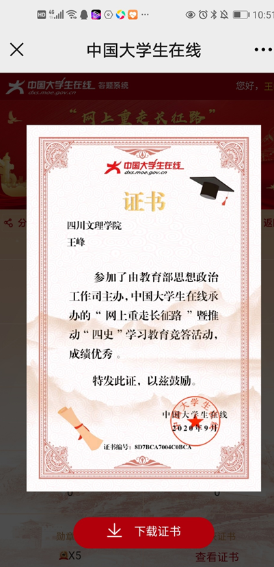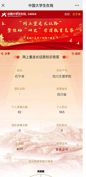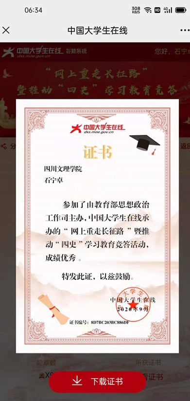 此次活动以线上和线下相结合的方式展开,线上依托太阳成集团tyc33455cc微信公众号平台,以学习时长和答题积分截图为证。线下以个人或集体学习笔记(文字、图片、视频)为依据。自6月1日起只6月底,开展了为期一个月的“四史”专题学习竞赛。全院教职工积极参与此次活动,较为系统地学习了“四史”理论、深刻地理解“四史”学习的意义、透彻地领悟了“四史”涵义。排行榜上也是你追我赶,此起彼伏。在党政负责人积极带领下,此次活动参与面广,效果良好。比如:石宁卓老师在线积分高达965,高居榜首。王峰书记和石宁卓老师获得了“四史学习”优秀证书(电子版)、付琴老师分享了线下学习笔记等。