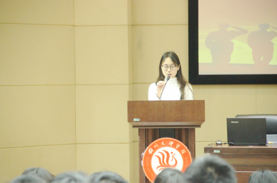 尹超老师宣布大会开始,首先由2016级军训优秀学员代表刘坤英发言,分享她军训的生活与感受,并告诫参训学员珍惜军训机会,加强锻炼。随后,2017级学员代表范诗萍代表全体军训学员庄严承诺,铿锵有力的誓言久久回荡,让人热血沸腾,激情满怀。紧接着,尹超老师作了新生军训相关工作的安排及注意事项的说明。