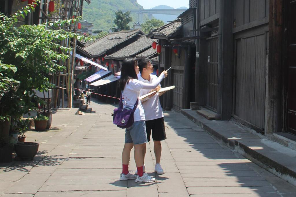 图为实践团队在土城古镇讨论建筑的材质、结构及后期维护方面的内容。 赵文洁 摄