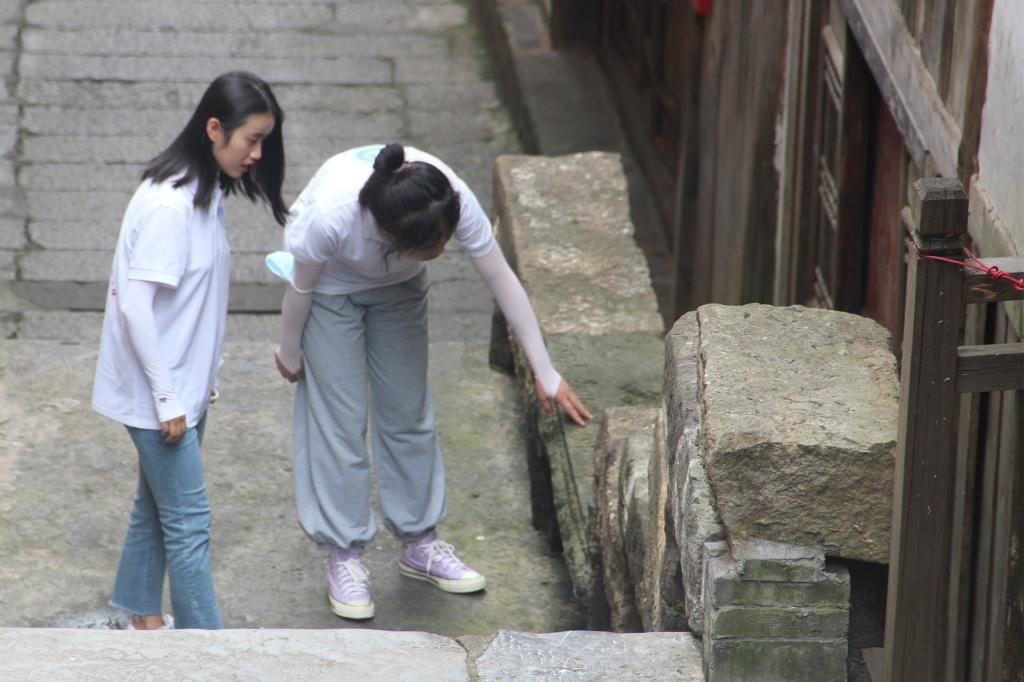 图为团队成员卓祺和毕平阳在观察茅台镇的建筑材料、结构。 赵文洁 摄