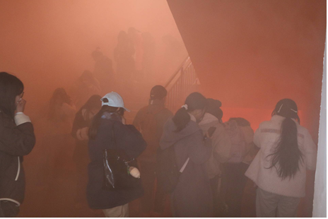 演练模拟真实火灾场景。随着警报响起,全体师生迅速响应,按照预定疏散路线,采取低姿、捂口鼻等防护姿态,有序撤离至指定安全区域。整个过程组织严密、响应及时、秩序井然,展现出公司师生良好的应急反应意识和协同配合能力。