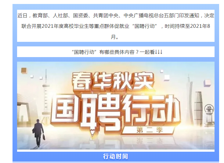 3.加强宣传总结。各地各单位要配合做好“国聘行动”宣传工作,运用新闻媒体、网络微信等渠道,向社会广泛发布活动内容、招聘信息等,吸引各方积极参与,营造良好舆论氛围。要及时掌握工作进度成效,定期汇总招聘数据,做好阶段性工作总结,有关典型经验和做法及时报教育部、人力资源社会保障部、国务院国资委、共青团中央。