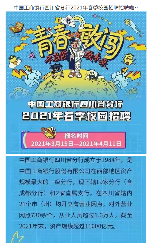 中国工商银行四川省分行2021年春季校园招聘(川文理就[2021]0349号)