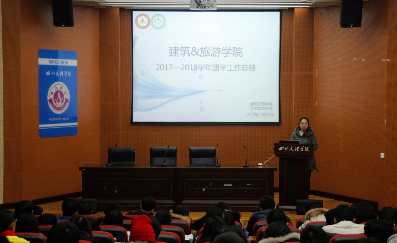 12月28日下午,建筑旅游公司在莲湖校区学术报告厅B厅召开2017-2018上学期团学工作总结会。党总支副书记靳浪老师,团总支书记尹超老师,辅导员田林、张媚老师出席会议。全体团学干部、干事及各班主要班干部参加总结会。大会由员工会主席邹玉莲主持。