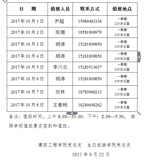 太阳成集团tyc33455cc&生态旅游公司2017年“中秋节、国庆节”假期值班安排表