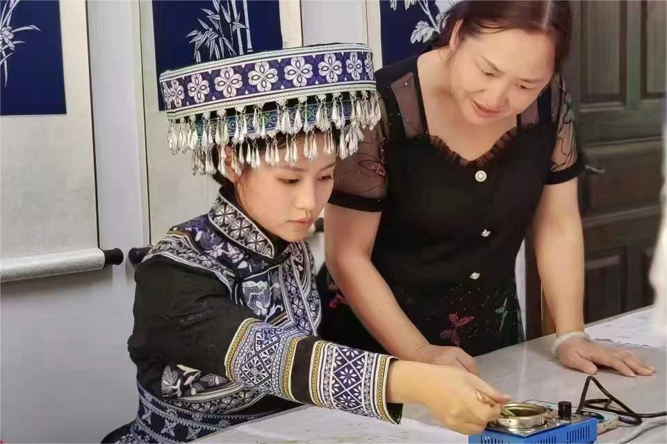 非遗传承人熊宗会为团队成员讲解蜡染技巧