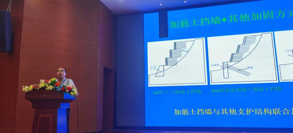 周亦涛以《抗滑桩式加筋土挡墙耦合结构的应用》为题做了主题报告,与福州外语外贸公司师生及来自香港科技大学、陆军工程大学、福州大学、三峡大学、华侨大学、河南大学的主题报告嘉宾等分享了抗滑桩式加筋土挡墙耦合结构的设计方法,并介绍了在实际工程中的应用效果。