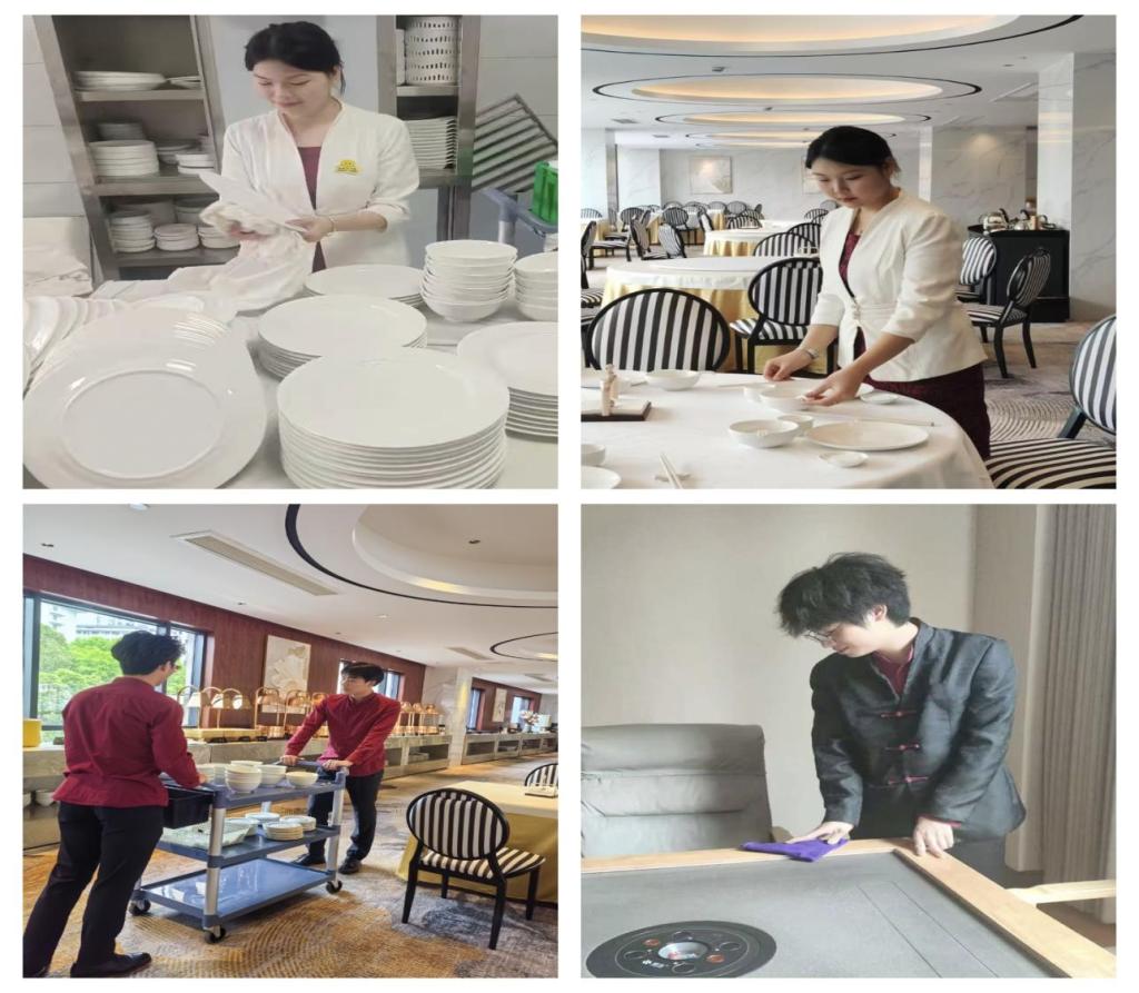 见习期间,同学们按照4人一组,每组一周依次轮流在酒店几个主要一线服务部门开展顶岗见习。从初入酒店岗位的青涩与不熟悉到迅速进入角色,眼神中充满了对知识汲取和能力提升的渴望;从专业地帮客人点餐到耐心解答客人问询;从认真擦拭每一个餐具到精心摆台;从认真清洁布置环境到微笑、高效对客服务,每一项工作都一丝不苟,同学们在实践中逐渐熟悉了相应岗位的服务流程和服务技巧,专业技能、服务意识、专业素养得到了全方面的提升,团队合作精神得以加强。