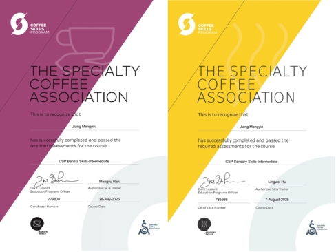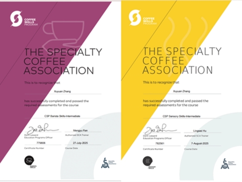 图3 公司两位教师取得SCA国际咖啡师技能和感官品鉴资格证书