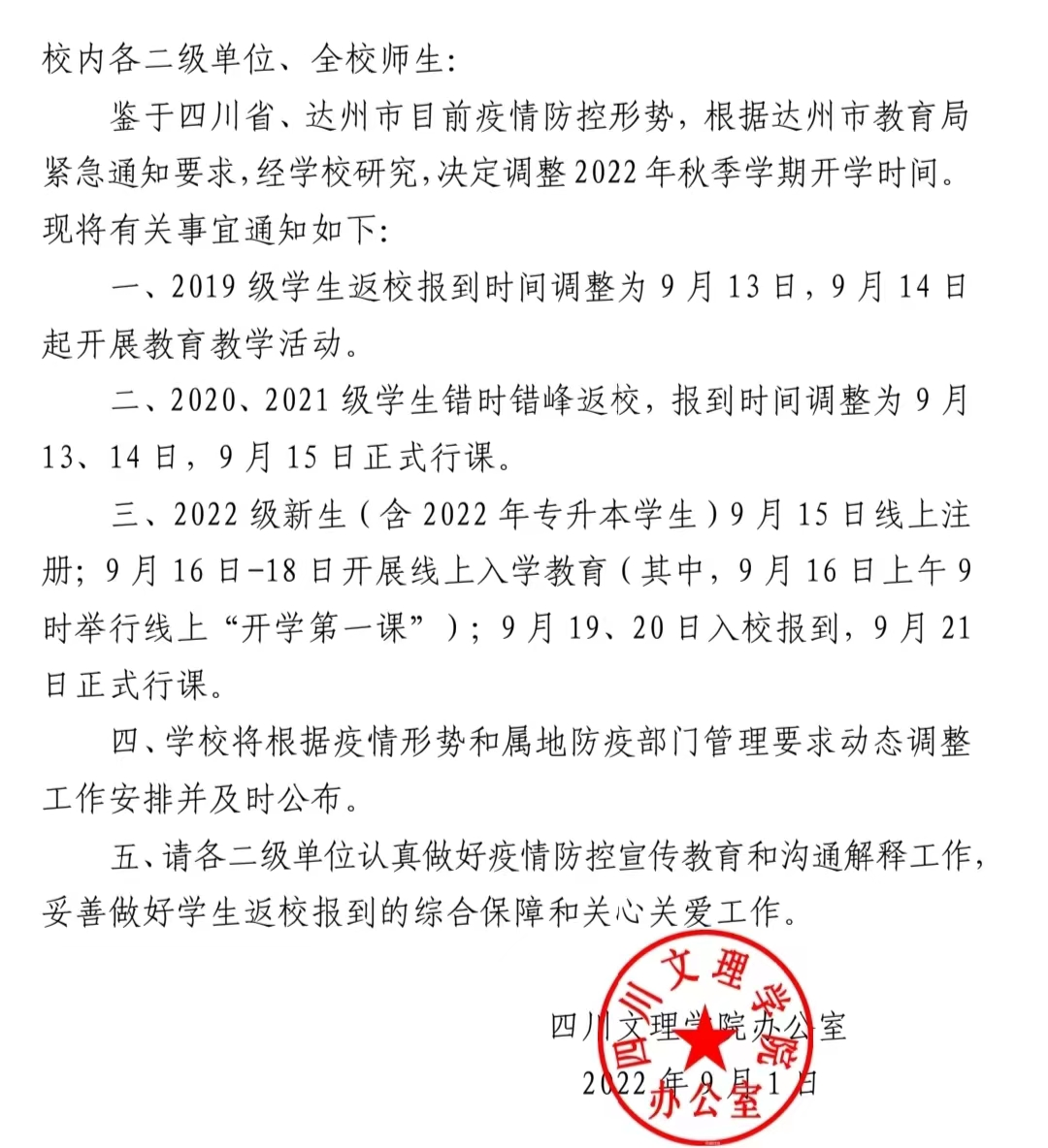 关于再次调整2022年秋季开学时间的紧急通知