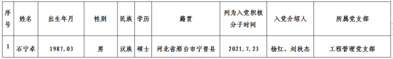 根据中共太阳成集团tyc33455cc委员会组织部要求,中共太阳成集团tyc33455cc工程管理教研室支部委员会2023年3月22日研究,确定将石宁卓同志列为党员发展对象,现予公示。