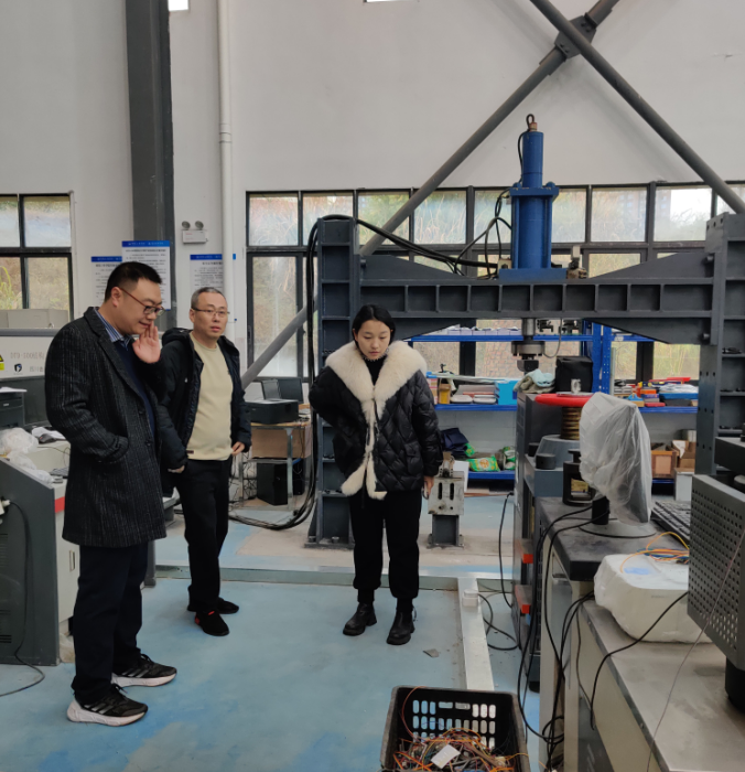 姚灿和吕晶晶老师首先来到工程训练中心,在侯荣老师带领下,参观了建筑实体模型楼和土木工程实训实验中心,并对实体模型楼构造节点、土木工程实训实验中心的大型实验设备进行了现场学习和交流。