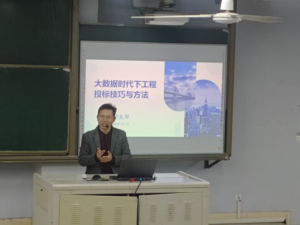 为提升员工对大数据时代下工程投标领域的理解,增强实践能力,公司于12月12日在博文楼327教室举办了“大数据时代下工程投标技巧与方法”专题讲座。讲座由工程造价教研室邓太平副教授主讲,太阳成集团tyc33455cc大二、大三员工参加讲座。