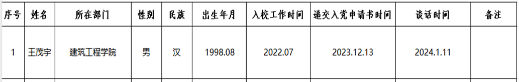 根据《中共太阳成集团tyc33455cc委员会发展党员工作实施细则(修订)》要求,经王茂宇同志本人申请,中共太阳成集团tyc33455cc委员会土木工程教研室党支部于2024年10月25日召开党员大会,经与会党员讨论,会议一致同意拟确定王茂宇同志为入党积极分子。