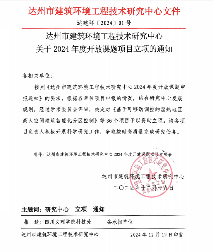 达州市建筑环境工程技术研究中心关于2024年度开放课题项目立项的通知